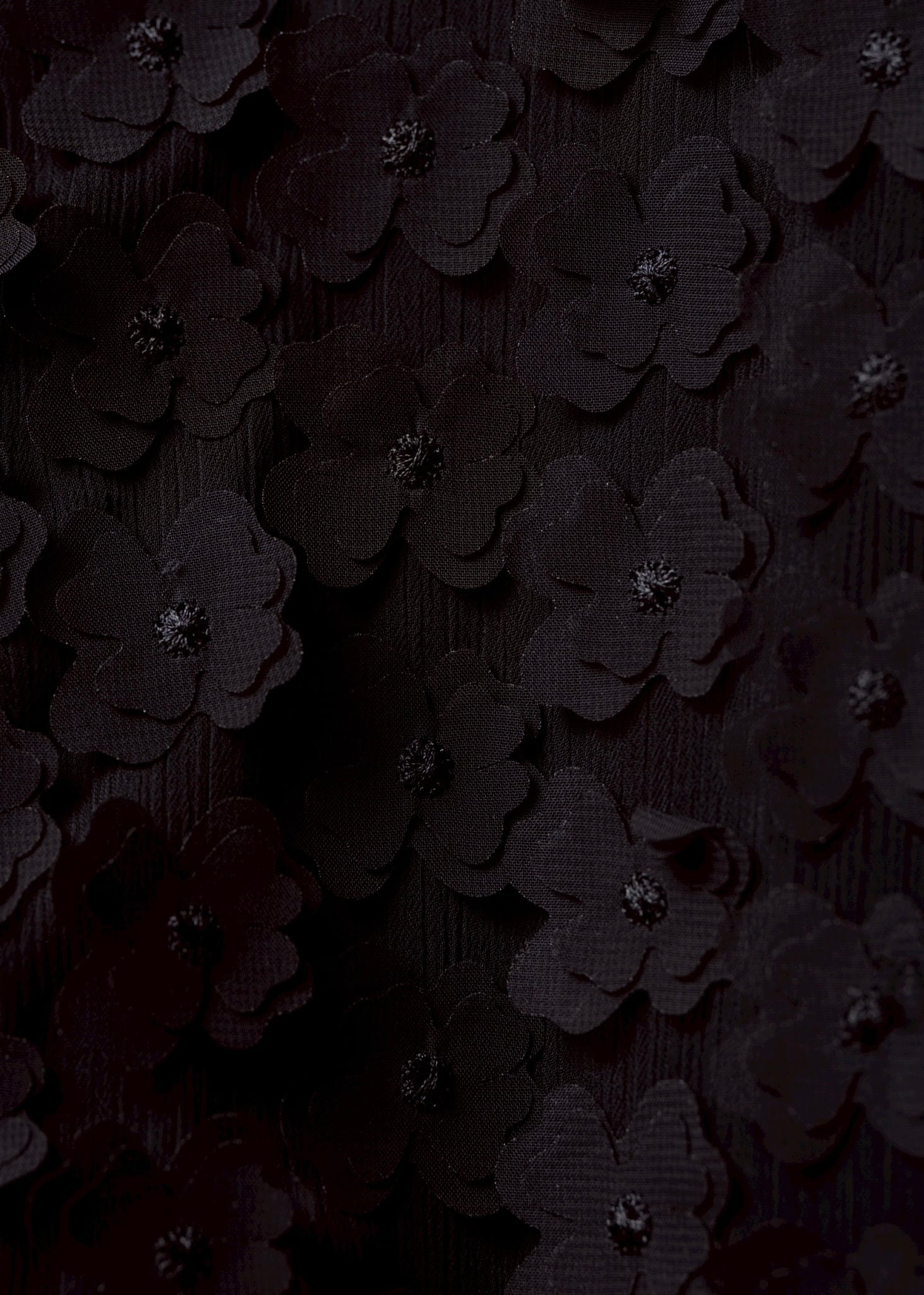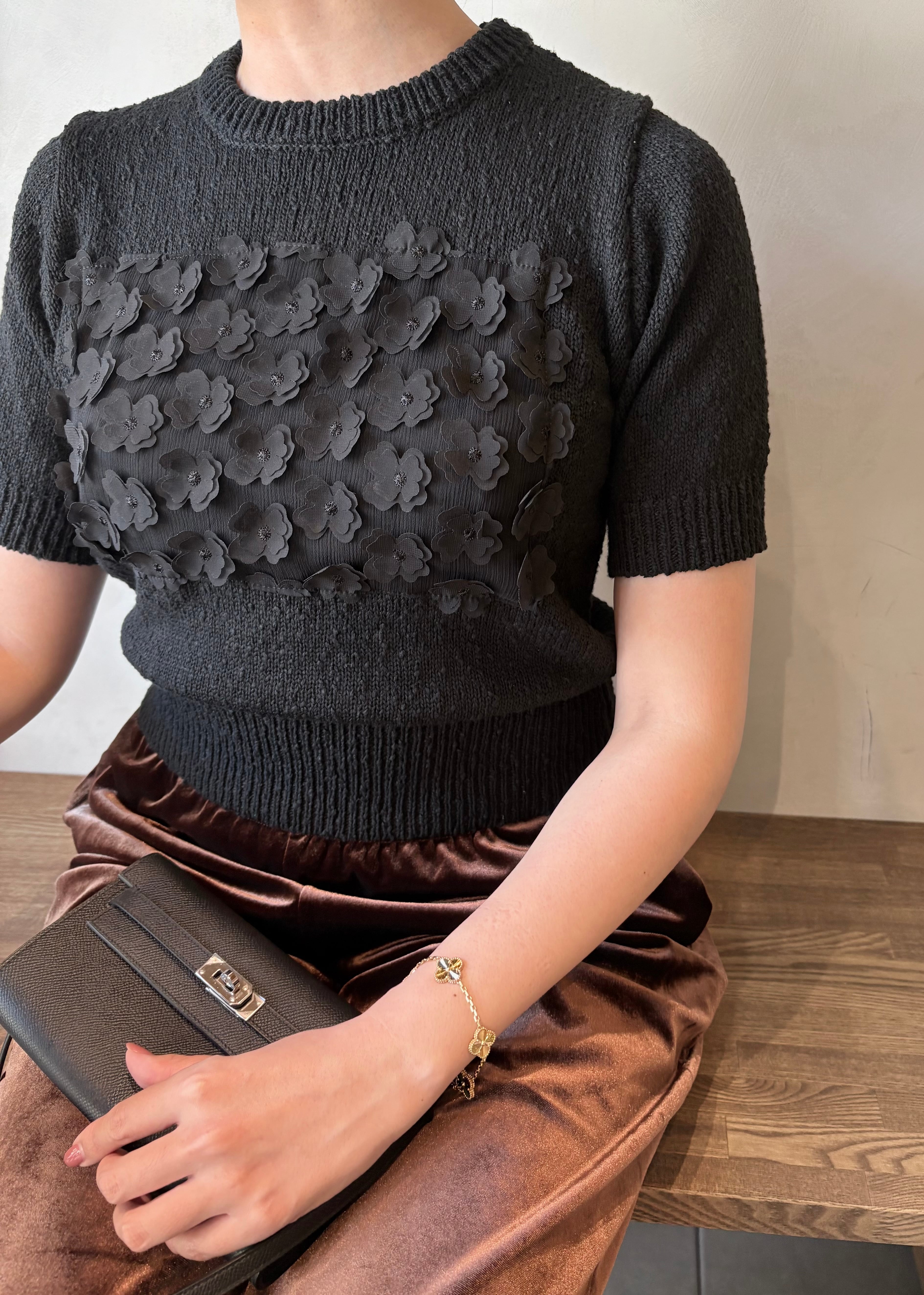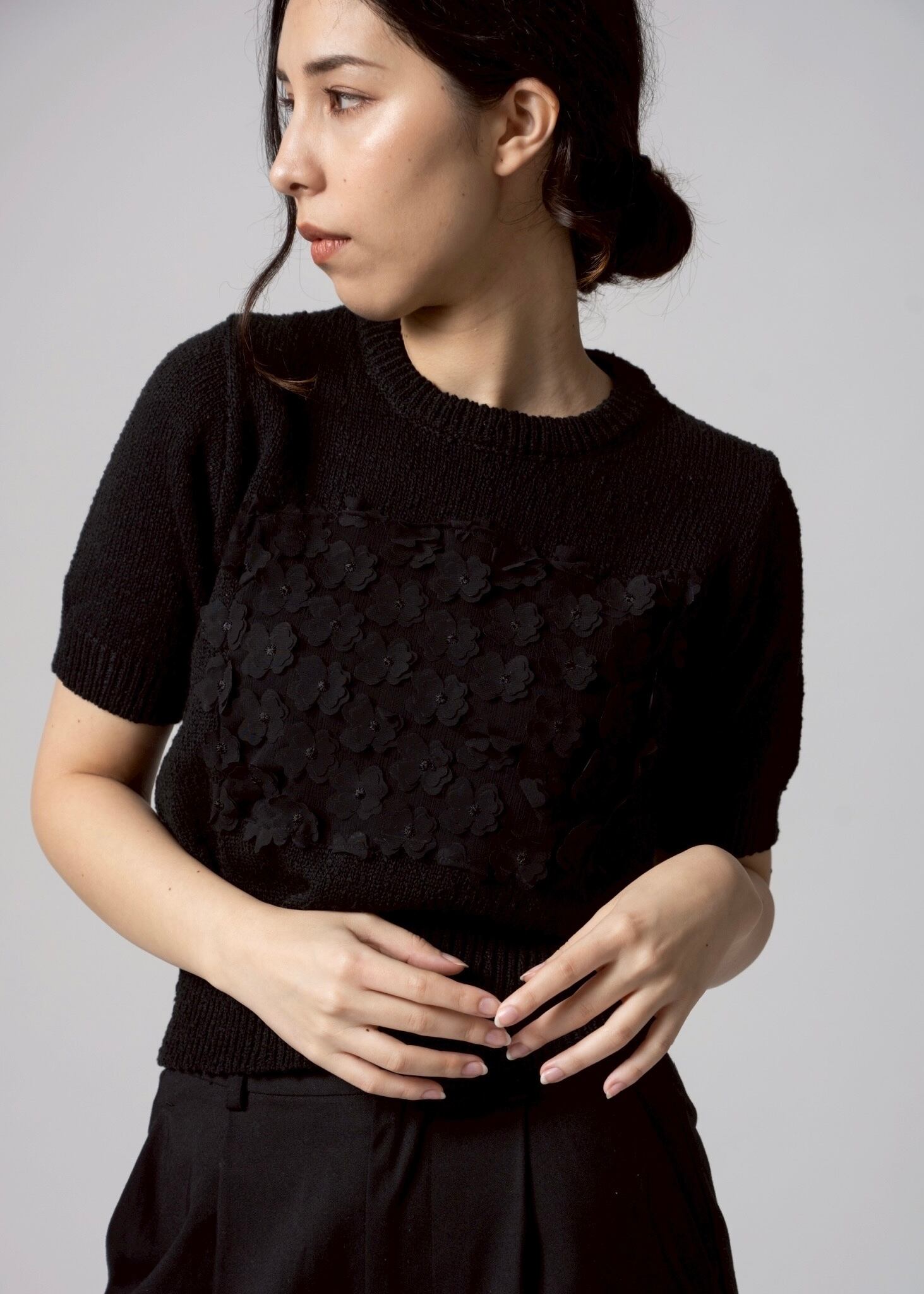 程良い肉厚感と毛羽立ちの少ないサラッとした質感のポリエステルニットに立体感のある繊細なフラワーモチーフをあしらったオーガンジー生地をデザイン。